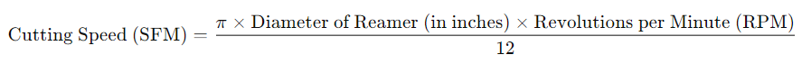 Скорость резания или скорость поверхности относится к скорости, с которой режущий кромка движется через заготовку. Обычно он измеряется в поверхностных футах в минуту (SFM) или метров в минуту (м/мин). Чтобы вычислить правильную скорость резки для развертывания, используйте следующую формулу: